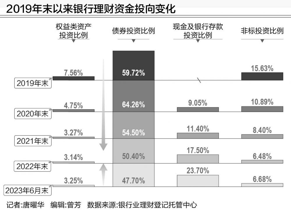 伴随2018年资管新规出台,银行理财近年来逐步压缩非标投资比例,同时逐步提高债券投资的比例,在净值化的趋势下,银行理财为了追求净值稳定越来越保守,在打新收益不再稳赚不赔的情况下,权益类投资也成为被压缩的对象,而现金及银行存款投资比例近年来则明显提高。
