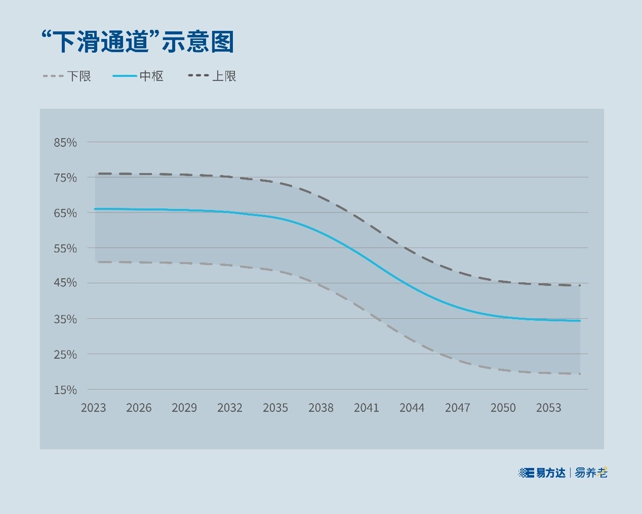 “生产出炉”的成品下滑曲线,如下图所示,它以权益类资产比例的中枢及其上限、下限,构成一个“下滑通道”。