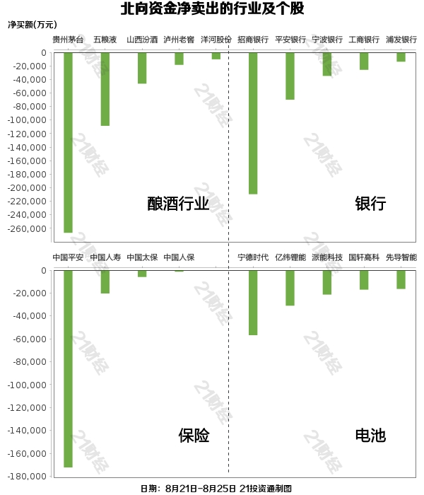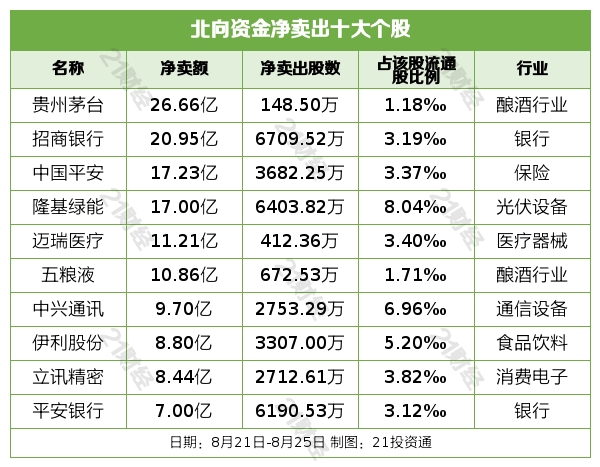 北向资金净卖出贵州茅台(600519.SH)、招商银行(600036.SH)、中国平安(601318.SH)、隆基绿能(601012.SH)、迈瑞医疗(300760.SZ)居前,其中,贵州茅台被净卖出26.66亿元,招商银行被净卖出20.95亿元,中国平安被净卖出17.23亿元,隆基绿能被净卖出17.00亿元,迈瑞医疗被净卖出11.21亿元。