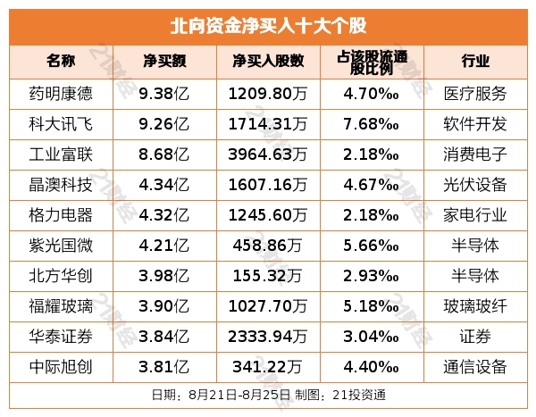 个股方面,北向资金净买入药明康德(603259.SH)、科大讯飞(002230.SZ)、工业富联(601138.SH)、晶澳科技(002459.SZ)、格力电器(000651.SZ)居前,其中,药明康德被净买入9.38亿元,科大讯飞被净买入9.26亿元,工业富联被净买入8.68亿元,晶澳科技被净买入4.34亿元,格力电器被净买入4.32亿元。