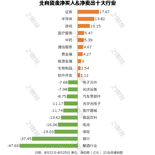 从净买入金额来看,北向资金增持了32个行业,其中证券居首,净买入金额达17.67亿元,其次是半导体行业,净买入13.82亿元。北向资金减持了68个行业,其中酿酒行业最多,净卖出金额达47.69亿元,其次是银行行业,净卖出37.45亿元。