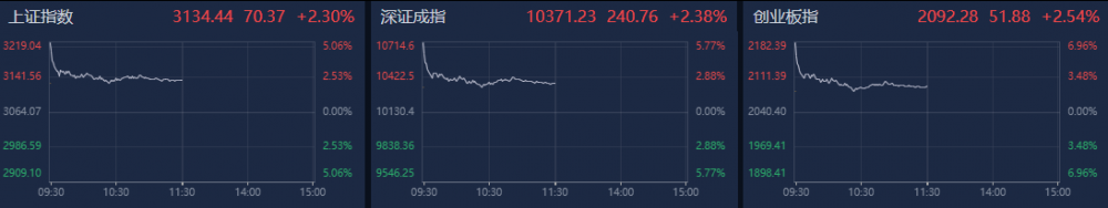 A股三大股指早间大幅高开,随后震荡回落、涨幅收窄。南财金融终端显示,截至上午收盘,上证指数涨2.30%,深证成指涨2.38%,创业板指涨2.54%。沪深两市个股涨多跌少,合计近4600只个股上涨。
