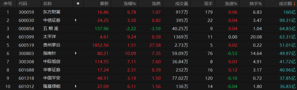 沪深两市半天成交额7776亿元,较上一交易日同期放量3130亿元。个股方面,截至午间收盘,东方财富成交额排名第一,达160亿元;中信证券、五粮液、太平洋、贵州茅台成交额也在50亿元以上,分别为99.31亿元、64.83亿元、63.31亿元、51.01亿元。