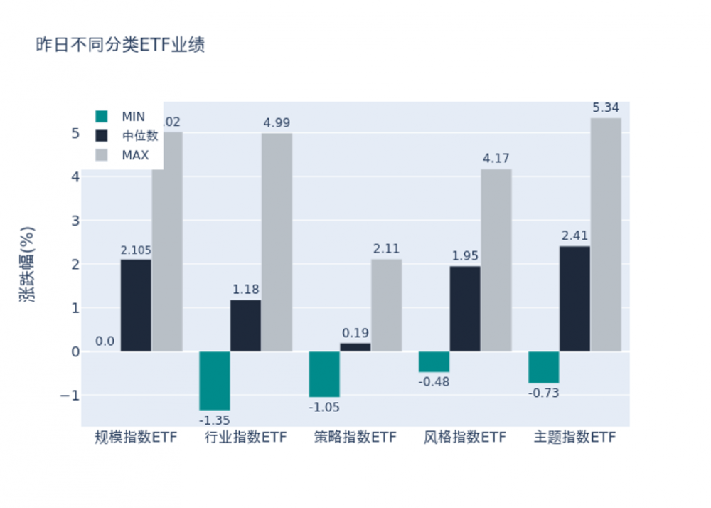 昨日股票型ETF收益率中位数为2.05%。其中按照不同分类,规模指数中鹏华上证科创板50成份增强策略ETF收益率最高,为5.02%;行业指数中嘉实上证科创板新一代信息技术ETF收益率最高,为4.99%;策略指数中前海开源中证500等权ETF收益率最高,为2.11%;风格指数中国寿安保创精选88ETF收益率最高,为4.17%;主题指数中华夏中证机床ETF收益率最高,为5.34%。