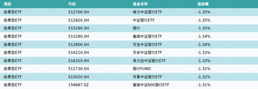 昨日股票型ETF跌幅最大的3只ETF及其收益率分别为:南方中证银行ETF(-1.35%)、中证银行ETF(-1.35%)、银行(-1.35%)。跌幅前10详情见下表: