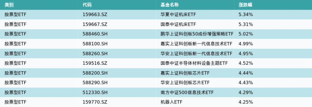 昨日股票型ETF涨幅最高的3只ETF及其收益率分别为:华夏中证机床ETF(5.34%)、国泰中证机床ETF(5.31%)、鹏华上证科创板50成份增强策略ETF(5.02%)。涨幅前10详情见下表: