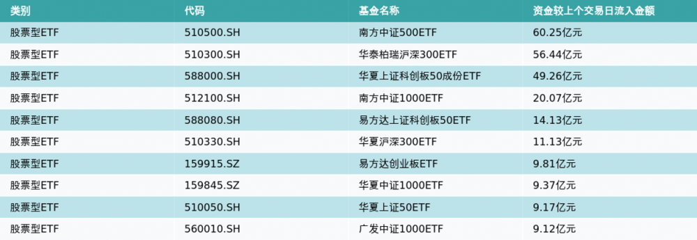 昨日股票型ETF资金流入最多的3只ETF及其流入金额分别为:南方中证500ETF(流入60.25亿元)、华泰柏瑞沪深300ETF(流入56.44亿元)、华夏上证科创板50成份ETF(流入49.26亿元)。资金流入前10详情见下表: