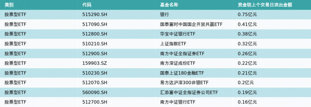 昨日股票型ETF资金流出最多的3只ETF及其流入金额分别为:银行(流出0.75亿元)、国泰富时中国国企开放共赢ETF(流出0.41亿元)、华宝中证银行ETF(流出0.38亿元)。资金流出前10详情见下表: