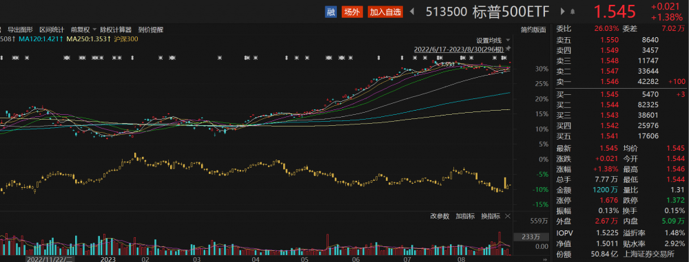 ETF方面,重仓苹果、微软、英伟达、谷歌、特斯拉的标普500ETF(513500)涨1.38%,溢折率1.48%。
