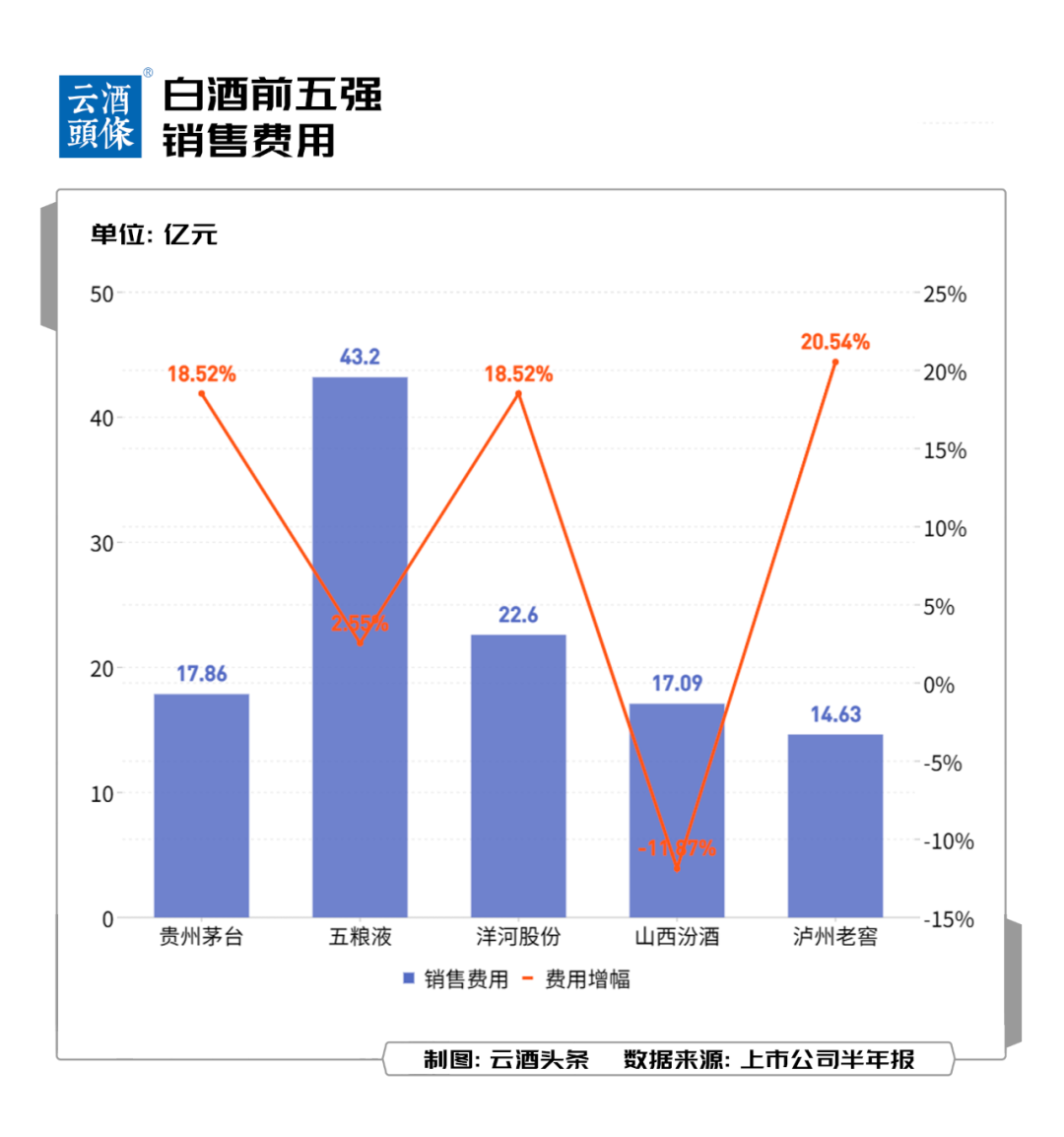 与之相对的是泸州老窖,销售费用一向排在前五强最末,但在今年上半年的增幅却是最高,达到20.54%。