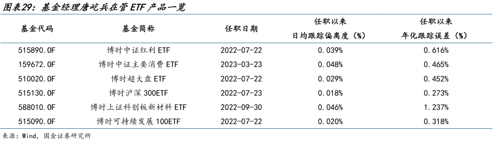 ETF产品追求跟踪偏离度和跟踪误差最小化,从在管基金的跟踪表现指标来看,唐屹兵在管ETF的日均跟踪偏离度全部在0.05%以下,年化跟踪误差绝大多数在0.5%以下。