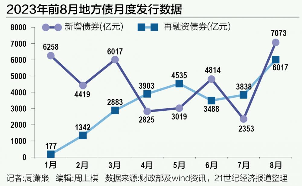 21世纪经济报道记者梳理发现,8月地方债发行规模达1.3万亿元,其中新增债券超7000亿元,再融资债券超6000亿元,均为今年以来月度发行峰值。