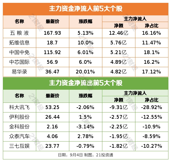 9月4日,大盘全天高开高走,沪指、深成指均涨超1%,北证50指数涨近6%。截至收盘,沪指涨1.4%,深成指涨1.41%,创业板指涨0.85%。总体上个股涨多跌少,两市近4000只个股上涨。沪深两市成交额8849亿,较上个交易日放量1396亿。北向资金全天大幅净买入68.84亿元,结束连续5个交易日净卖出。 盘面上,华为概念股午后大涨,华映科技、捷荣技术、拓维信息等超10股涨停。顺周期板块全天强势,油气、钢铁、煤炭、有色等板块集体大涨,准油股份、宝地矿业、云煤能源、北方铜业等涨停。地产产业链概念股持续活跃,顶固集创、中源家居、爱丽家居等多股涨停。白酒股震荡反弹,金徽酒涨停。下跌方面,次新股陷入调整,康鹏科技、盛邦安全等跌超5%。