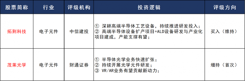 财通证券分析师张益敏当日发布研报首次覆盖茂莱光学,给予公司增持评级。公司作为工业级精密光学稀缺标的,上半年半导体业务增长强劲同比增近40%,核心产品助力光刻和量测国产化,此外公司正积极开拓VR/AR业务新客户,未来有望贡献新动力。