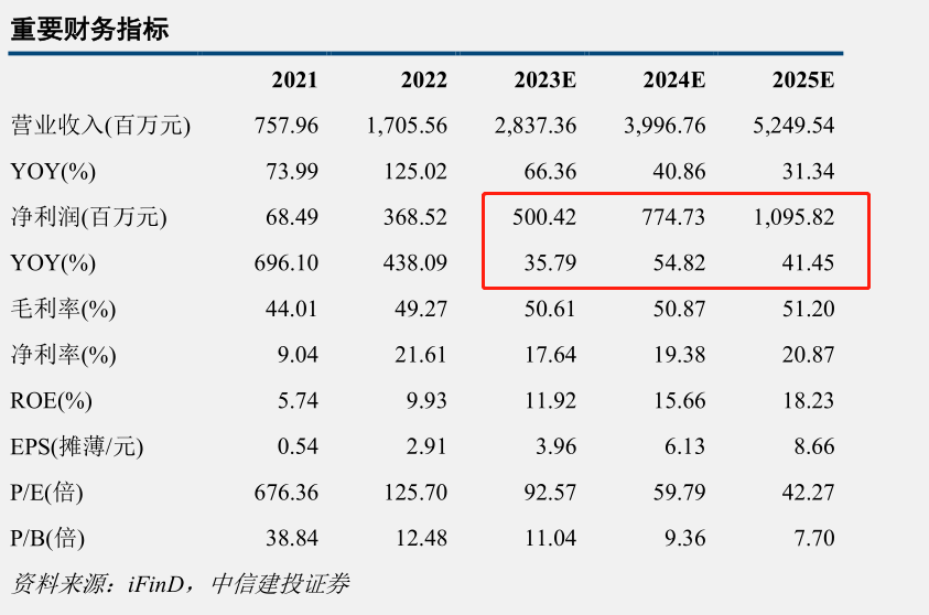 中信建投预计公司2023-2025年归母净利润分别为5.00、7.75、10.96亿元,同比分别增长35.79%、54.82%、41.45%,对应2023-2025年PE估值分别为92.57倍、59.79倍、42.27倍。