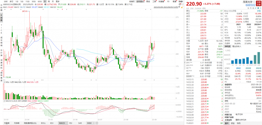 9月5日,半导体板块早盘走强,茂莱光学(688502.SH)高开后震荡上行,截至收盘涨3.27%报220.90元。