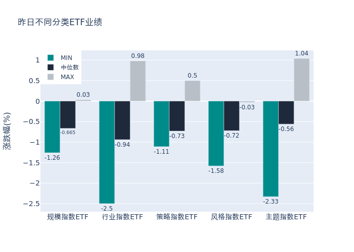 昨日股票型ETF收益率中位数为-0.66%。其中按照不同分类,规模指数中招商中证1000增强策略ETF收益率最高,为0.03%;行业指数中电力ETF收益率最高,为0.98%;策略指数中鹏扬中证国有企业红利ETF收益率最高,为0.5%;风格指数中易方达上证科创板成长ETF收益率最高,为-0.03%;主题指数中国泰中证光伏产业ETF收益率最高,为1.04%。
