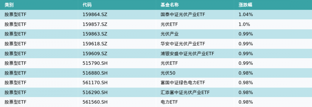 昨日股票型ETF涨幅最高的3支ETF及其收益率分别为:国泰中证光伏产业ETF(1.04%)、光伏ETF(1.0%)、光伏产业(0.99%)。涨幅前10详情见下表: