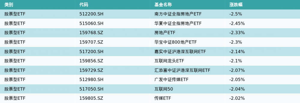 昨日股票型ETF跌幅最大的3支ETF及其收益率分别为:南方中证全指房地产ETF(-2.5%)、华夏中证全指房地产ETF(-2.45%)、房地产ETF(-2.33%)。跌幅前10详情见下表: