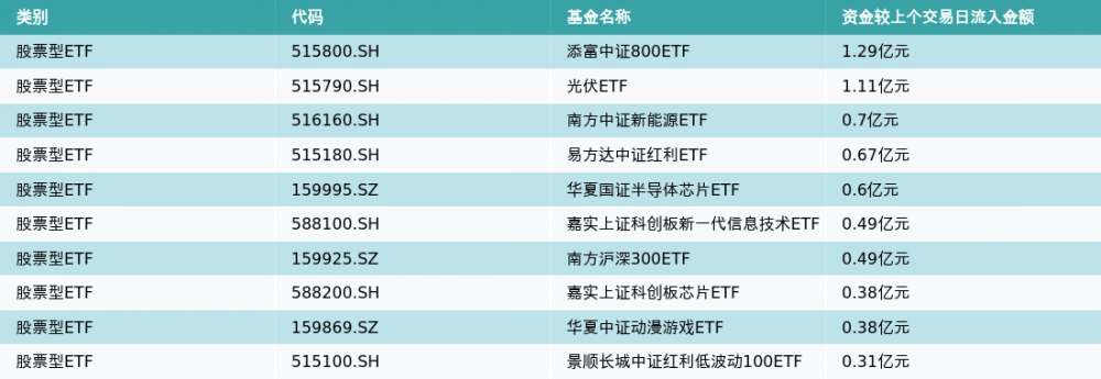 昨日股票型ETF资金流入最多的3支ETF及其流入金额分别为:添富中证800ETF(流入1.29亿元)、光伏ETF(流入1.11亿元)、南方中证新能源ETF(流入0.7亿元)。资金流入前10详情见下表: