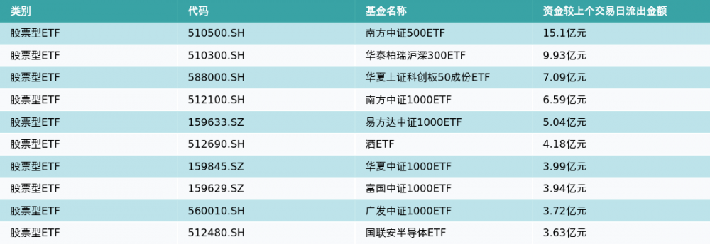 昨日股票型ETF资金流出最多的3支ETF及其流出金额分别为:南方中证500ETF(流出15.1亿元)、华泰柏瑞沪深300ETF(流出9.93亿元)、华夏上证科创板50成份ETF(流出7.09亿元)。资金流出前10详情见下表: