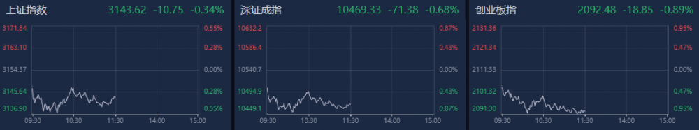 A股三大指数上午弱势震荡,创业板指跌近1%。南财金融终端显示,截至上午收盘,上证指数跌0.34%,深证成指跌0.68%,创业板指跌0.89%。沪深两市个股跌多涨少,合计超2700只个股下跌。