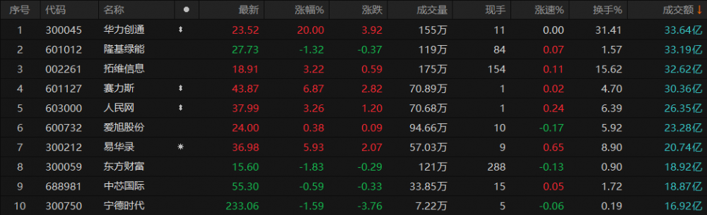 沪深两市半天成交额4357亿元,较上一交易日同期缩量879亿元。个股方面,截至午间收盘,华力创通成交额排名第一,达33.64亿元;隆基绿能、拓维信息、赛力斯成交额超30亿元,分别为33.19亿元、32.62亿元、30.36亿元。