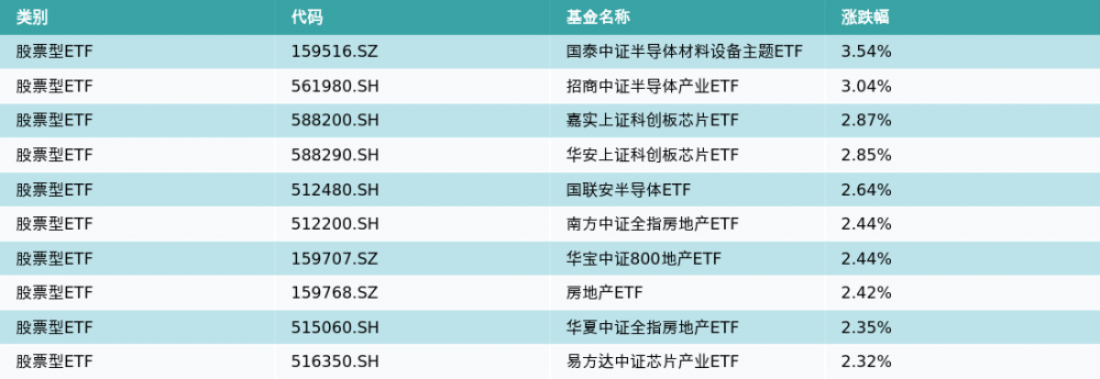 昨日股票型ETF涨幅最高的3支ETF及其收益率分别为:国泰中证半导体材料设备主题ETF(3.54%)、招商中证半导体产业ETF(3.04%)、嘉实上证科创板芯片ETF(2.87%)。涨幅前10详情见下表: