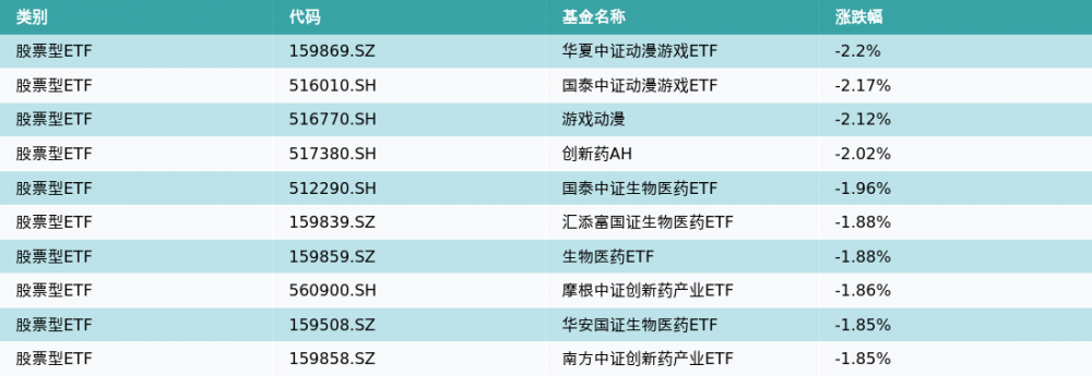 昨日股票型ETF跌幅最大的3支ETF及其收益率分别为:华夏中证动漫游戏ETF(-2.2%)、国泰中证动漫游戏ETF(-2.17%)、游戏动漫(-2.12%)。跌幅前10详情见下表: