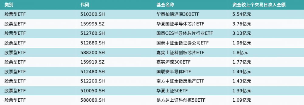 昨日股票型ETF资金流入最多的3支ETF及其流入金额分别为:华泰柏瑞沪深300ETF(流入5.54亿元)、华夏国证半导体芯片ETF(流入3.76亿元)、国泰CES半导体芯片行业ETF(流入3.13亿元)。资金流入前10详情见下表: