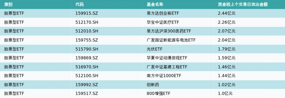 昨日股票型ETF资金流出最多的3支ETF及其流出金额分别为:易方达创业板ETF(流出2.44亿元)、华宝中证医疗ETF(流出2.26亿元)、易方达沪深300医药ETF(流出2.07亿元)。资金流出前10详情见下表: