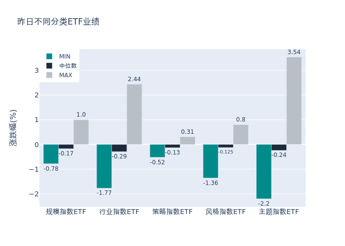 昨日股票型ETF收益率中位数为-0.2%。其中按照不同分类,规模指数中平安国证2000ETF收益率最高,为1.0%;行业指数中华宝中证800地产ETF收益率最高,为2.44%;策略指数中建信沪深300红利ETF收益率最高,为0.31%;风格指数中国寿安保创精选88ETF收益率最高,为0.8%;主题指数中国泰中证半导体材料设备主题ETF收益率最高,为3.54%。