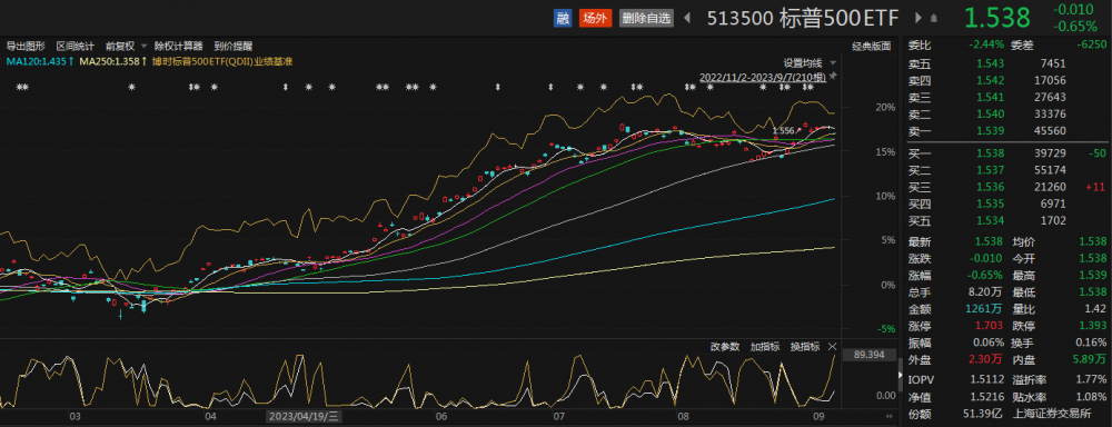 ETF方面,今日,重仓“七巨头”的标普500ETF(513500)低开,现跌0.65%,盘中交易大幅溢价,溢折率1.77%。9月6日,该ETF获主力资金加仓,净流入175万元。