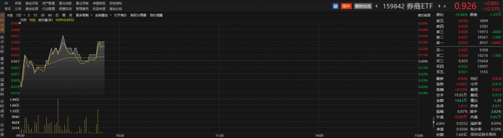 跟踪中证全指证券公司指数的券商ETF(159842)低开高走,盘中频现溢价交易。截至发稿,该ETF上涨0.33%,溢折率为0.09%,成交金额超1800万元。