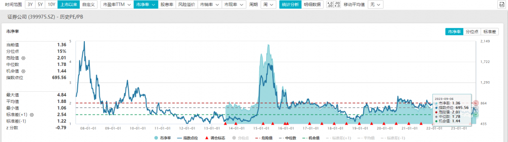 值得注意的是,中证全指证券公司指数 (399975)当前市净率处于历史较低水平。截至9月6日收盘,该指数市净率为1.36倍,处于上市以来15%分位点。