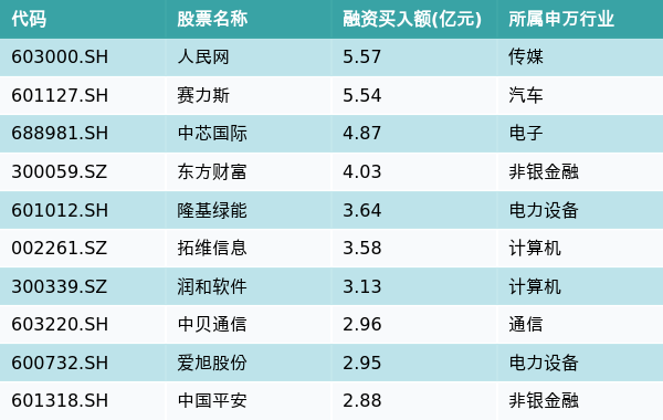9月6日,两市共有3279只个股有融资资金买入,其中人民网、赛力斯、中芯国际排名前三,买入金额分别5.57亿元、5.54亿元、4.87亿元。融资买入额前10个股详情见下表: