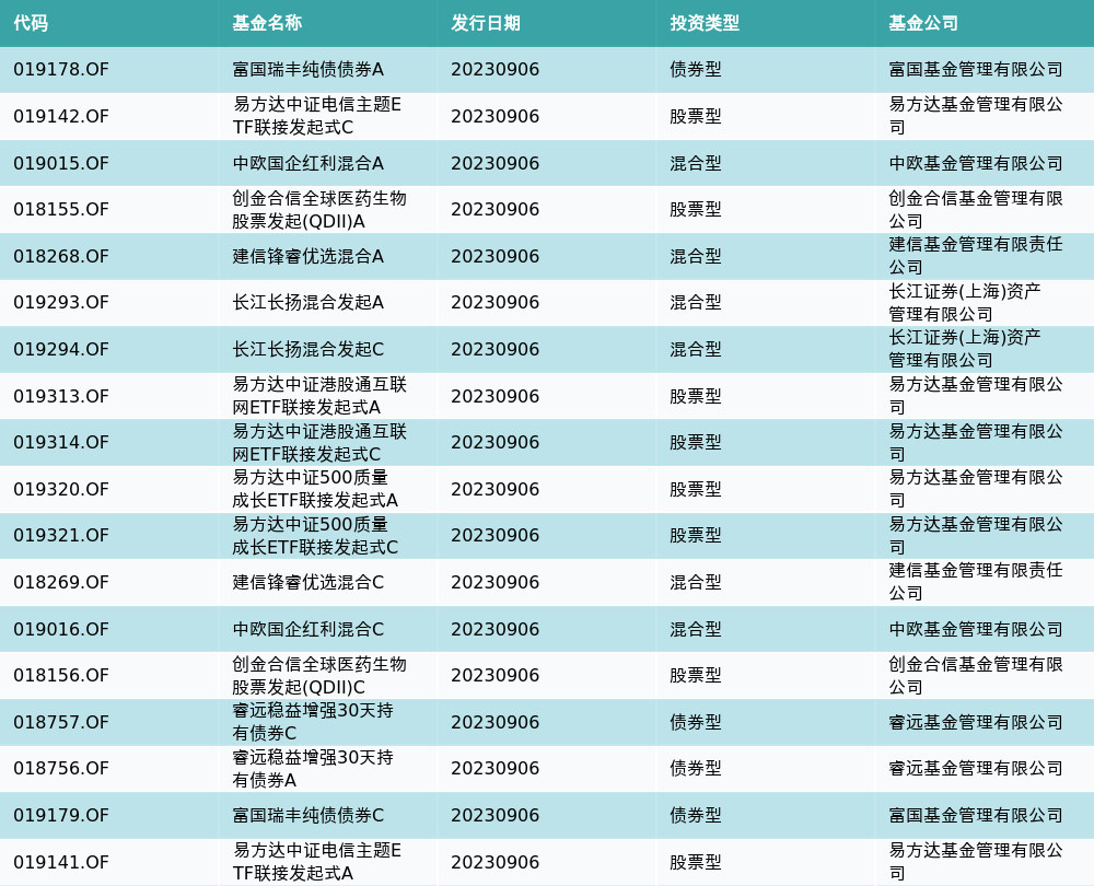 9月6日有18只新基金发行,分别为:富国瑞丰纯债债券A、易方达中证电信主题ETF联接发起式C、中欧国企红利混合A、创金合信全球医药生物股票发起(QDII)A、建信锋睿优选混合A、长江长扬混合发起A、长江长扬混合发起C、易方达中证港股通互联网ETF联接发起式A、易方达中证港股通互联网ETF联接发起式C、易方达中证500质量成长ETF联接发起式A、易方达中证500质量成长ETF联接发起式C、建信锋睿优选混合C、中欧国企红利混合C、创金合信全球医药生物股票发起(QDII)C、睿远稳益增强30天持有债券C、睿远稳益增强30天持有债券A、富国瑞丰纯债债券C、易方达中证电信主题ETF联接发起式A,详情见下表: