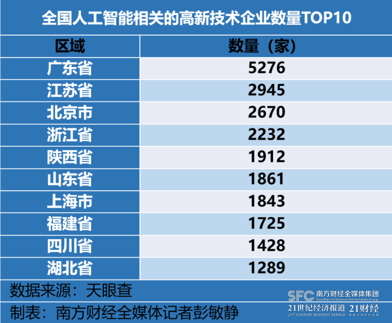 南方财经全媒体记者查询天眼查数据了解到,截至9月10日,全国存续在业的人工智能相关的高新技术企业共30446家,其中广东以5276家位列全国第一,江苏和北京分别以2945家和2670家,排名第二、第三。聚焦广东情况来看,广州和深圳以2295和1582位居全省前列,珠海则以364排名第三。
