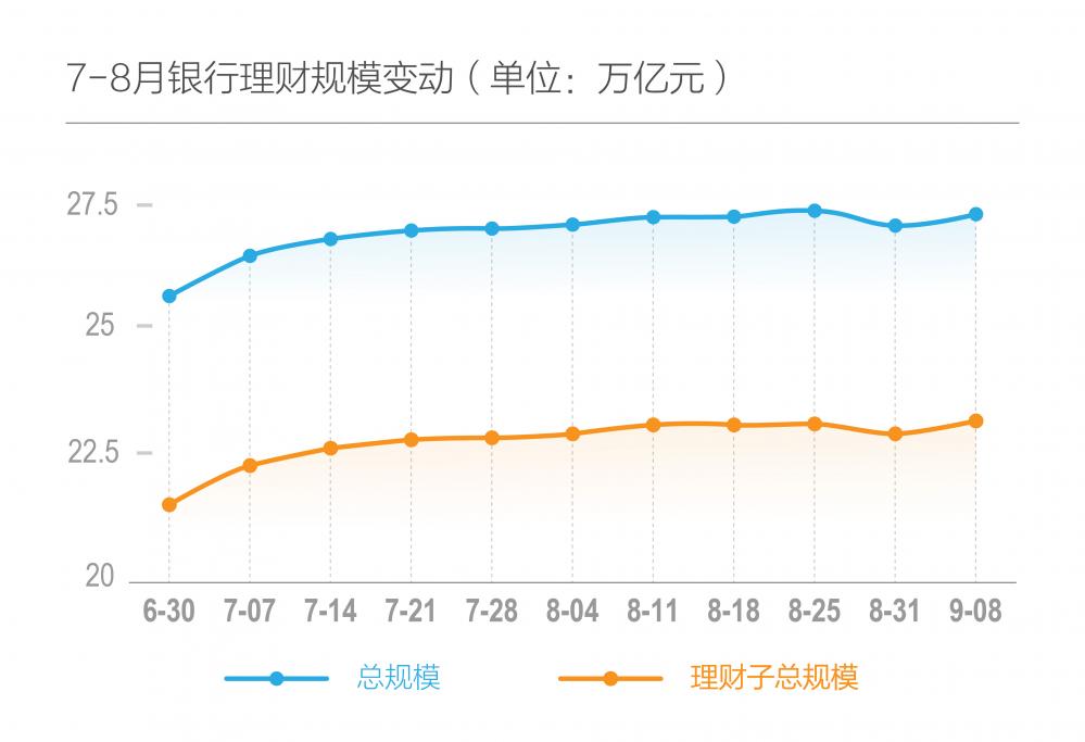 券商数据显示,8月全月银行理财产品整体规模震荡下行, 8月初银行理财整体规模为27.22万亿元,前三周均为上涨,最后一周规模回落至27.20万亿元。9月第一周银行理财规模快速回升,截至9月8日,全市场银行理财规模27.43万亿元,其中理财子规模23.26万亿元,为近6月最高水平。