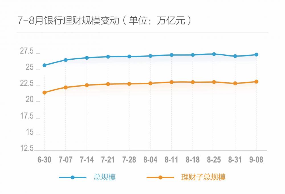券商数据显示,8月全月银行理财产品整体规模震荡下行,8月初银行理财整体规模为27.22万亿元,前三周均为上涨,最后一周规模回落至27.20万亿元。9月第一周银行理财规模快速回升,截至9月8日,全市场银行理财规模27.43万亿元,其中理财子规模23.26万亿元,为近6月最高水平。