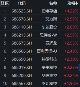 成分股涨跌互现。上涨个股中,佰维存储涨超4%,艾力斯、东芯股份、思特威-W、亚辉龙、百利天恒-U、纳微科技、安集科技、华峰测控涨逾2%。