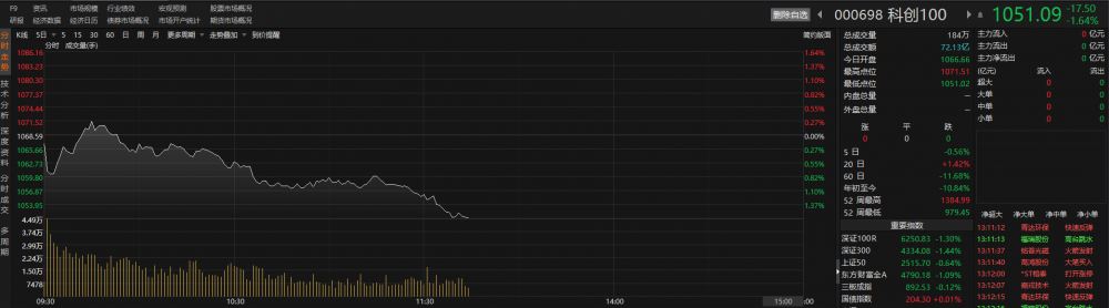 科创100指数(000698)早盘低开后一度冲高翻红,随后震荡回落,午后跌幅进一步扩大。截至发稿,该指数下跌1.64%。