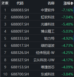 成分股跌多涨少。下跌个股中,中望软件、虹软科技跌超7%,光峰科技、博众精工跌超5%,铂力特、绿的谐波、经纬恒润-W、云从科技-UW、唯捷创芯跌逾4%;上涨个股中,艾力斯涨超5%,思特威-W涨逾4%。