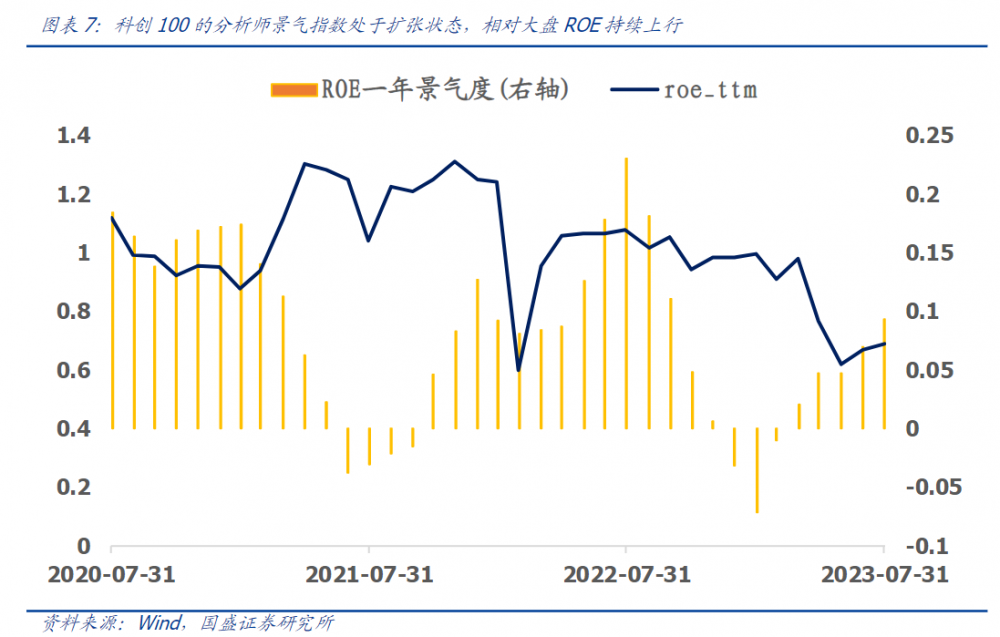 国盛证券近期指出,科创100分析师景气指数近期持续扩张,最新业绩指标底部企稳。科创100分析师景气指数从2023年3月底开始进入扩张区间,相对大盘ROE有望持续改善。指数的ROE_TTM在最低点6%附近企稳回升。从财务数据和分析师盈利预测调整看,指数未来盈利改善概率较大。