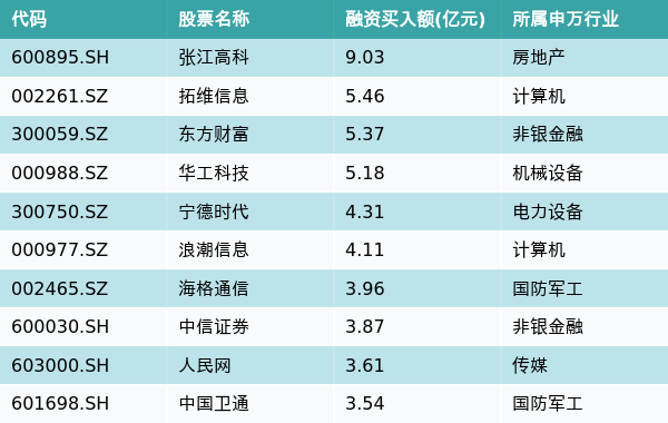 9月12日,两市共有3281只个股有融资资金买入,其中张江高科、拓维信息、东方财富排名前三,买入金额分别9.03亿元、5.46亿元、5.37亿元。融资买入额前10个股详情见下表: