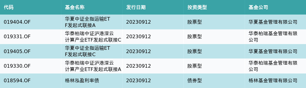 9月12日有5只新基金发行,分别为:华夏中证全指运输ETF发起式联接A、华泰柏瑞中证沪港深云计算产业ETF发起式联接C、华夏中证全指运输ETF发起式联接C、华泰柏瑞中证沪港深云计算产业ETF发起式联接A、格林泓盈利率债,详情见下表: