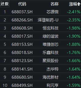 下跌成分股中,芯源微、泽璟制药-U跌超2%,恒玄科技、绿的谐波、唯捷创芯、乐鑫科技、聚辰股份等多股跌逾1%;上涨成分股中,信科移动-U涨超3%,百克生物涨超2%,极米科技涨逾1%。