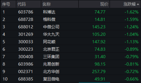 其中,科博达、格科微跌超1.5%,中微公司、华大九天、同花顺跌超1%,北京君正、三环集团、兆易创新等股跟跌。