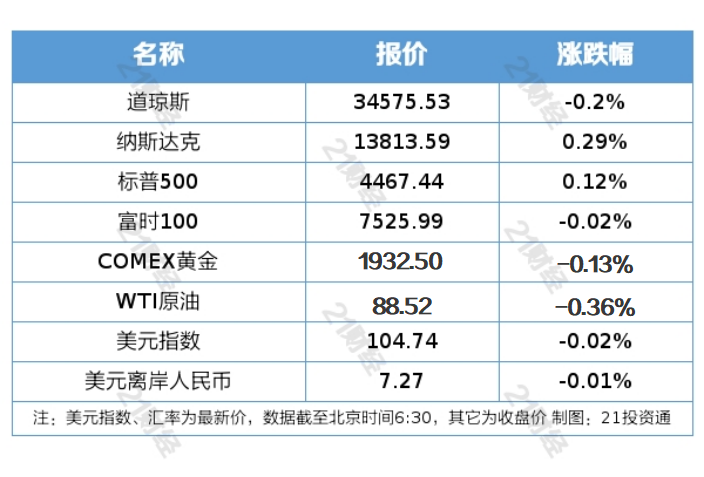 1、美股三大指数收盘涨跌不一,道指跌0.2%,纳指涨0.29%,标普500指数涨0.13%,热门科技股多数上涨,热门中概股普跌,纳斯达克中国金龙指数收跌0.64%。