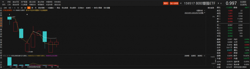 与中证800指数相关的增强ETF——800增强ETF(159517)早盘窄幅盘整,交投持续活跃。截至发稿,该ETF价格与前一交易日持平,换手率高达14.42%。